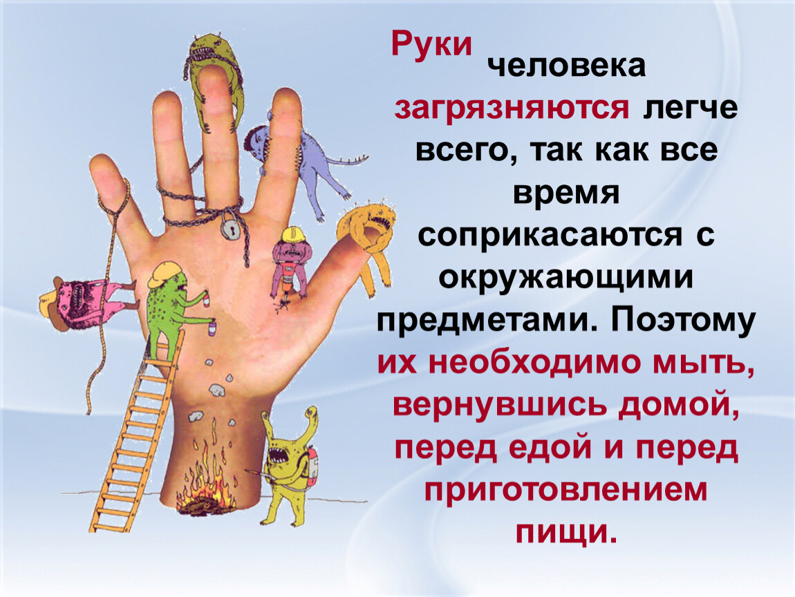 человека загрязняются легче всего, так как все время соприкасаются с окружающими предметами. Поэтому их необходимо мыть, вернувшись домой, перед едой и перед приготовлением пищи.