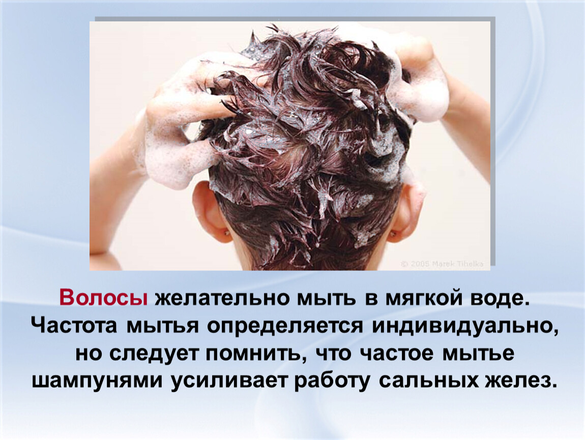 Волосы желательно мыть в мягкой воде. Частота мытья определяется индивидуально, но следует помнить, что частое мытье шампунями усиливает работу сальных желез.