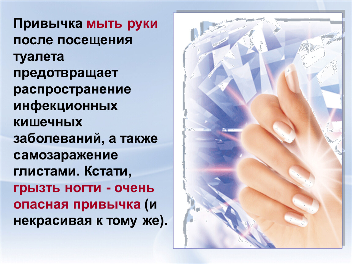 Привычка мыть руки после посещения туалета предотвращает распространение инфекционных кишечных заболеваний, а также самозаражение глистами. Кстати, грызть ногти - очень опасная привычка (и некрасивая к тому же).