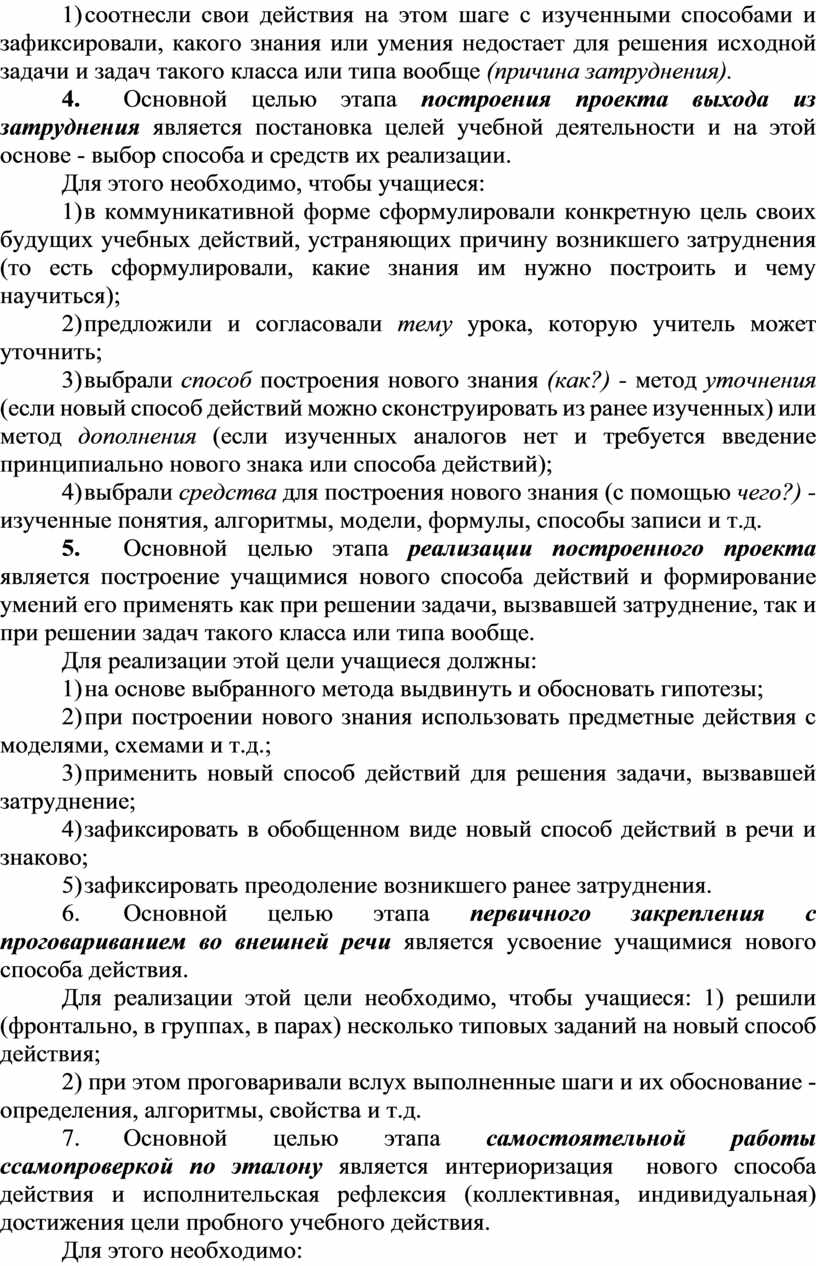 5. Основной целью этапа реализации построенного проекта является построение учащимися нового способа действий и формирование умений его применять как при решении задачи, вызвавшей затруднение, так и при решении задач такого класса или типа вообще.