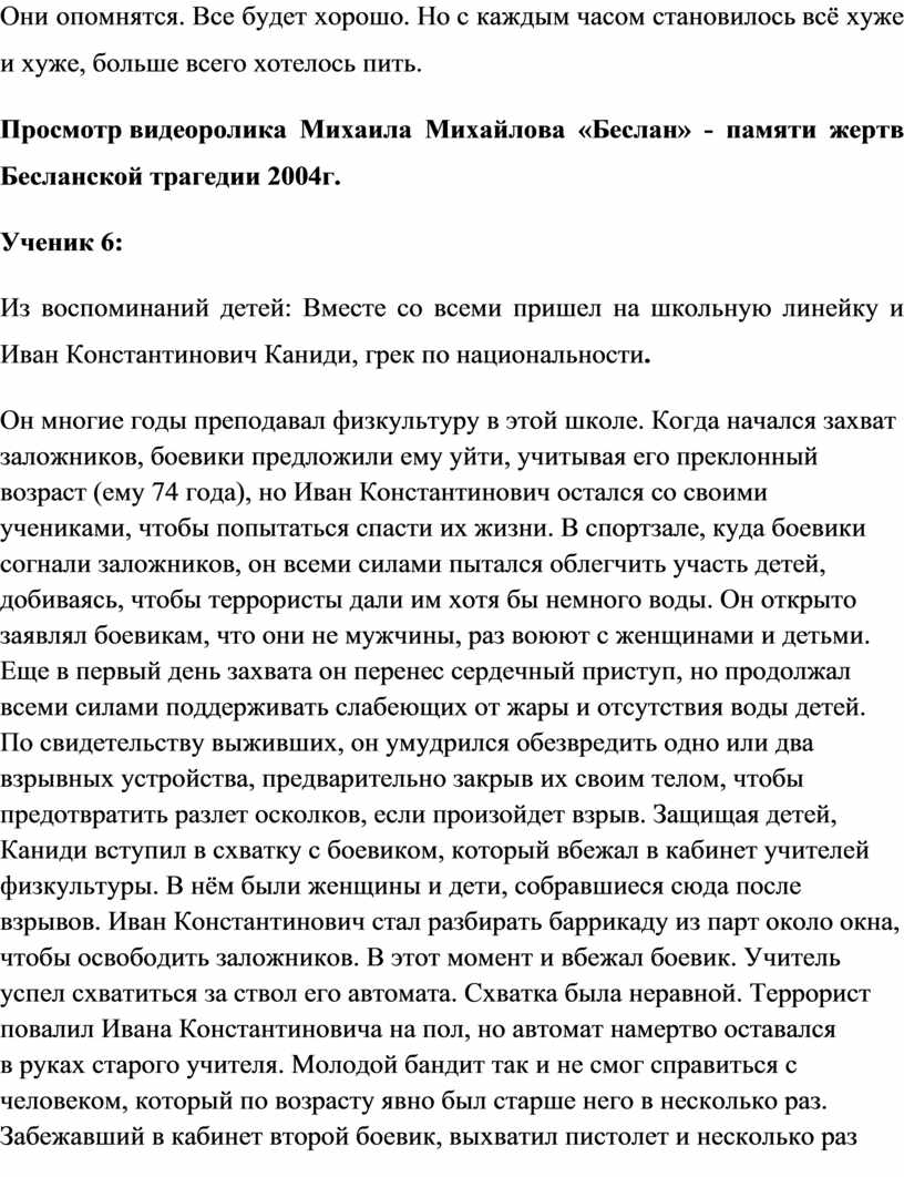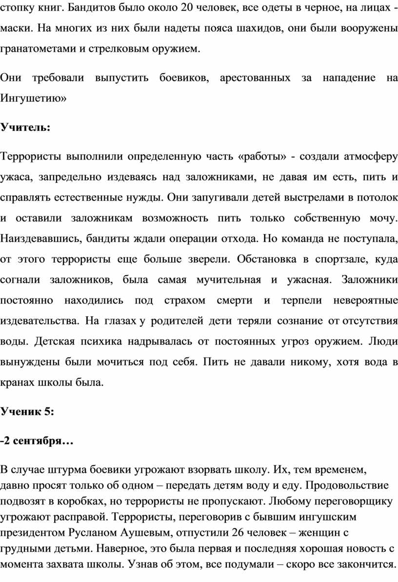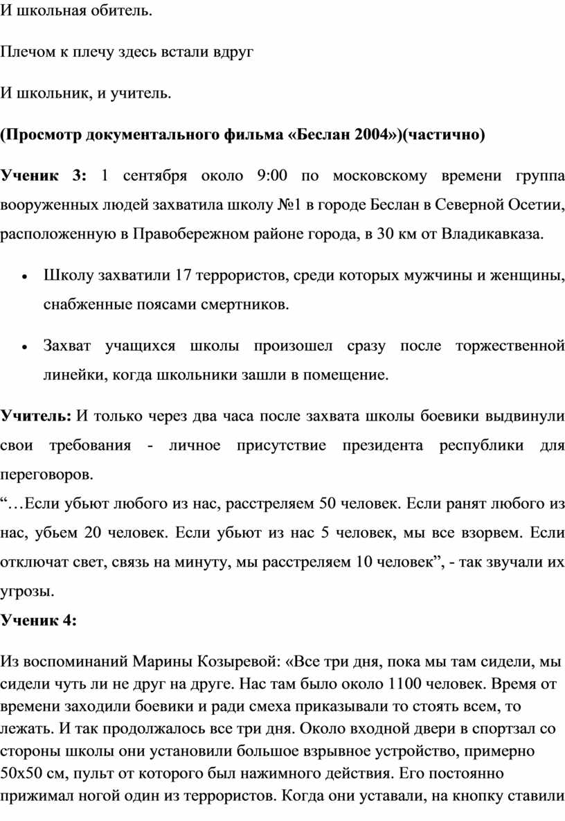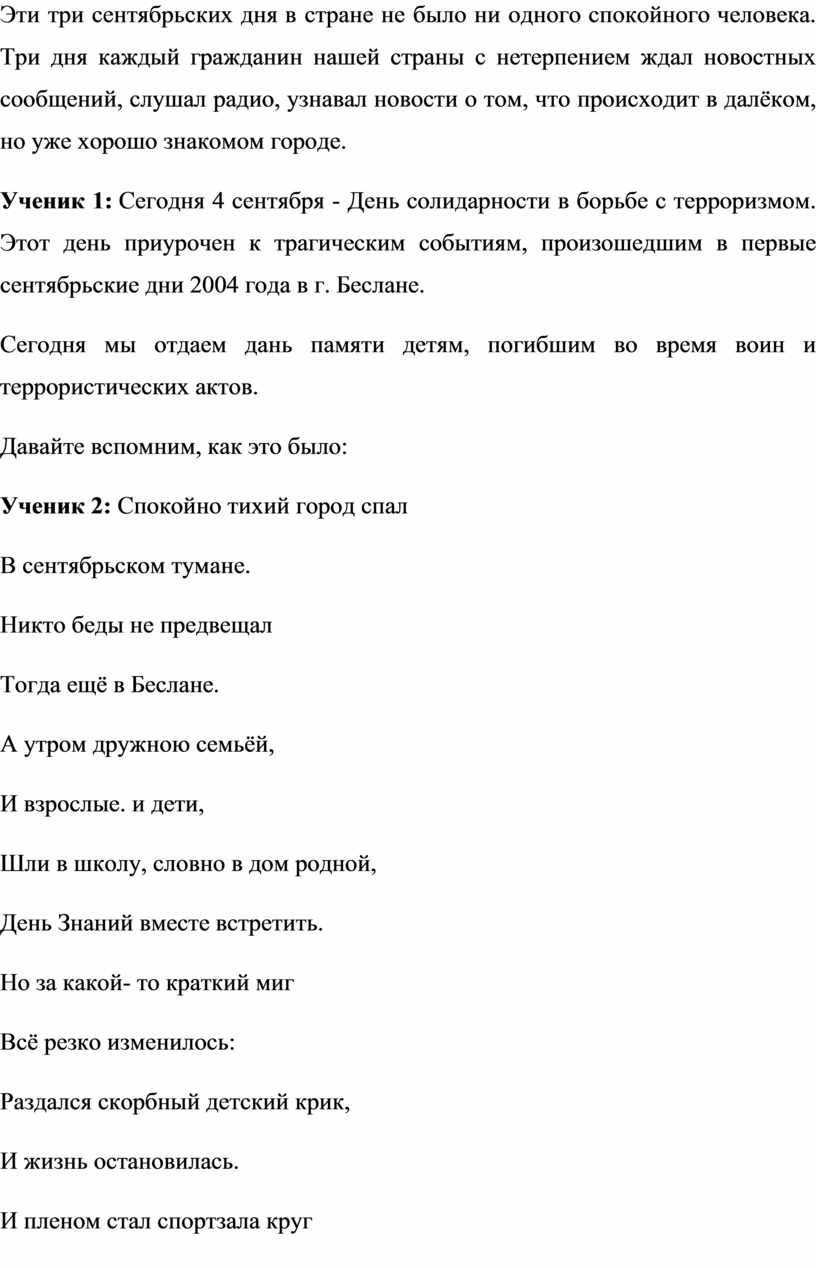Ученик 1: Сегодня 4 сентября - День солидарности в борьбе с терроризмом. Этот день приурочен к трагическим событиям, произошедшим в первые сентябрьские дни 2004 года в г. Беслане.
