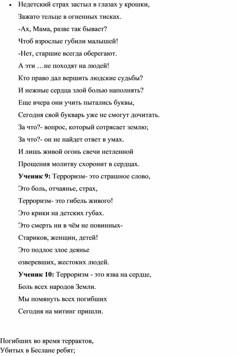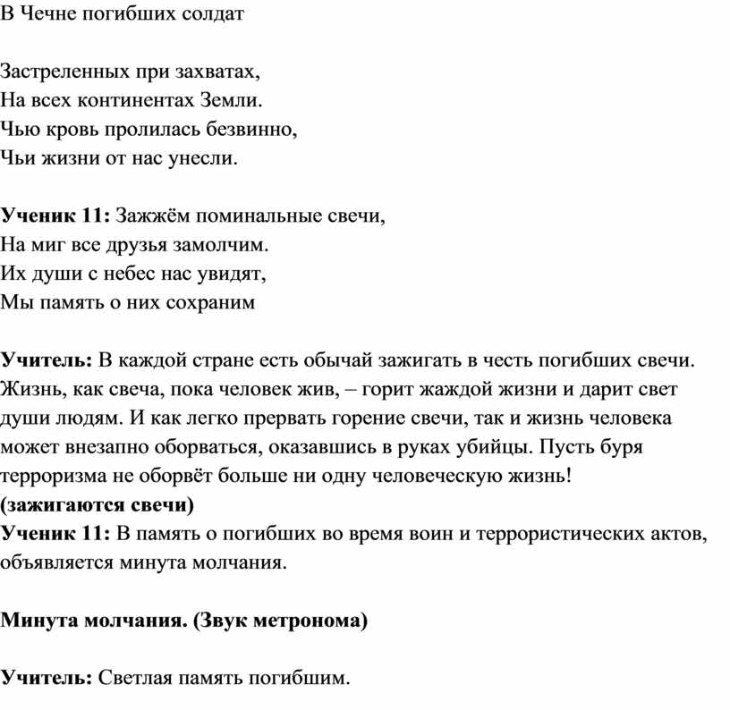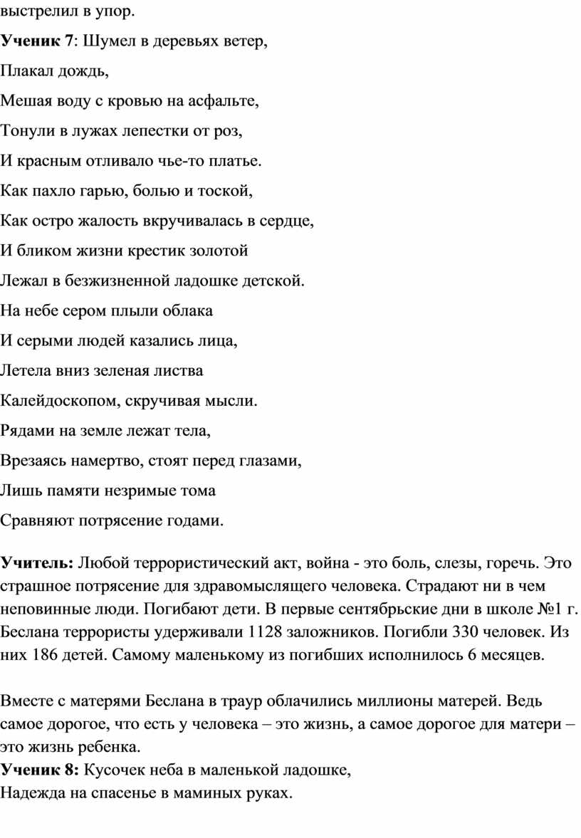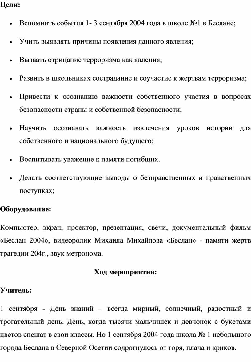 Ученик 1: Сегодня 4 сентября - День солидарности в борьбе с терроризмом. Этот день приурочен к трагическим событиям, произошедшим в первые сентябрьские дни 2004 года в г. Беслане.