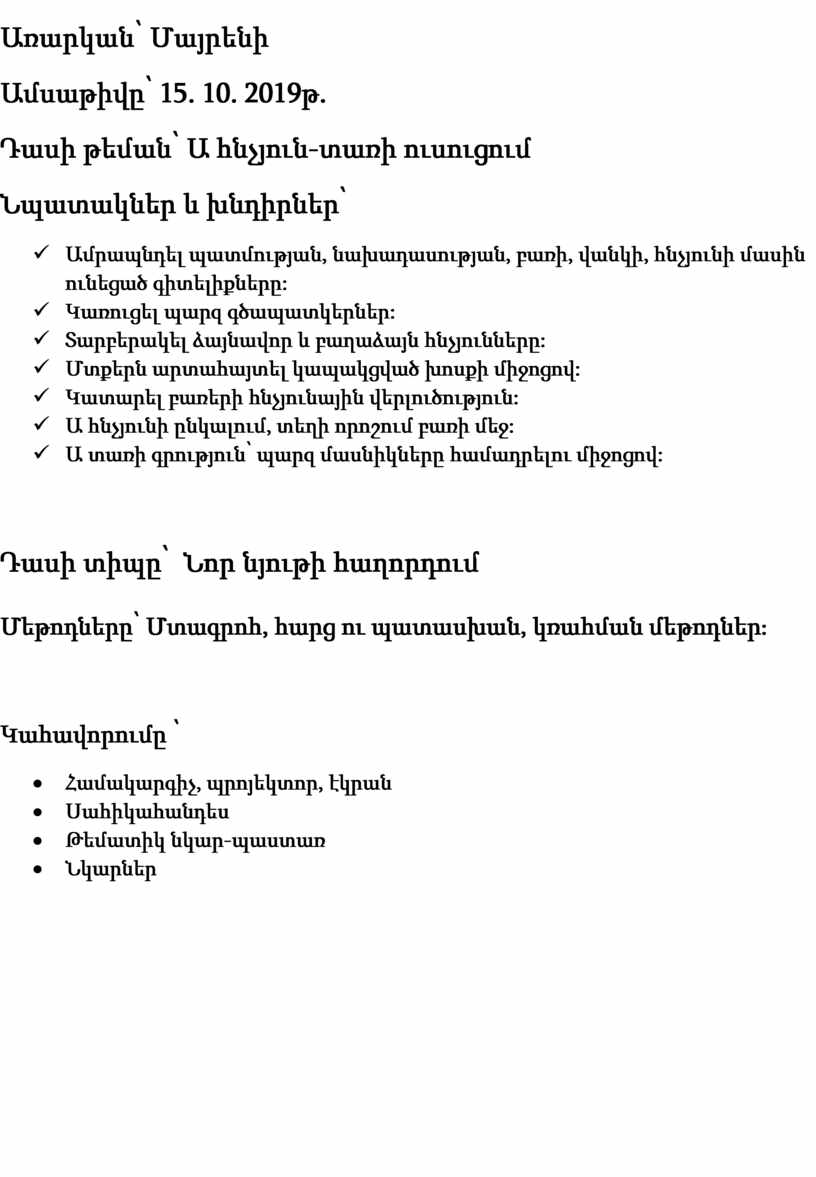 Դասի թեման՝ Ա հնչյուն-տառի ուսուցում