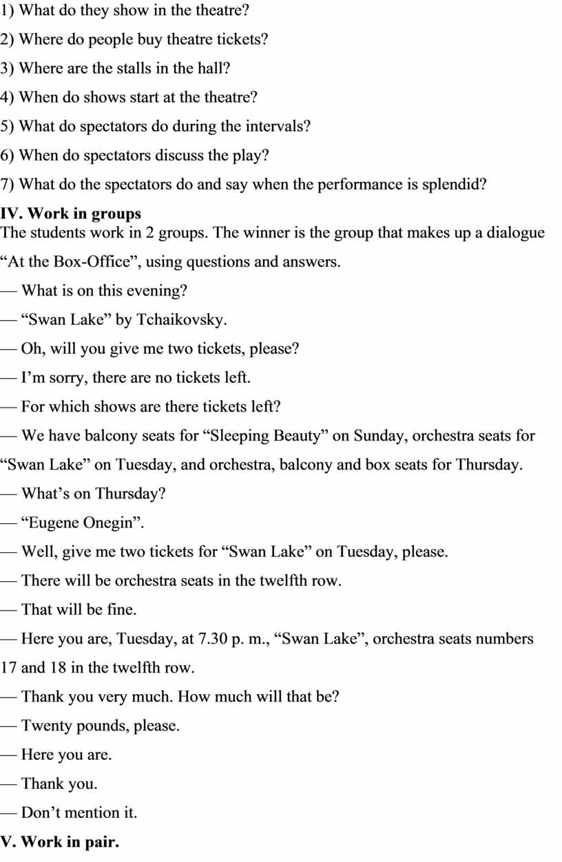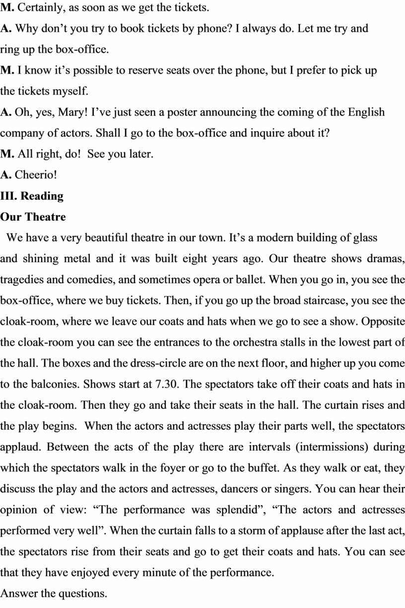 and shining metal and it was built eight years ago. Our theatre shows dramas, tragedies and comedies, and sometimes opera or ballet. When you go in, you see the box-office, where we buy tickets. Then, if you go up the broad staircase, you see the cloak-room, where we leave our coats and hats when we go to see a show. Opposite the cloak-room you can see the entrances to the orchestra stalls in the lowest part of the hall. The boxes and the dress-circle are on the next floor, and higher up you come to the balconies. Shows start at 7.30. The spectators take off their coats and hats in the cloak-room. Then they go and take their seats in the hall. The curtain rises and the play begins. When the actors and actresses play their parts well, the spectators applaud. Between the acts of the play there are intervals (intermissions) during which the spectators walk in the foyer or go to the buffet. As they walk or eat, they discuss the play and the actors and actresses, dancers or singers. You can hear their opinion of view: “The performance was splendid”, “The actors and actresses performed very well”. When the curtain falls to a storm of applause after the last act, the spectators rise from their seats and go to get their coats and hats. You can see that they have enjoyed every minute of the performance.