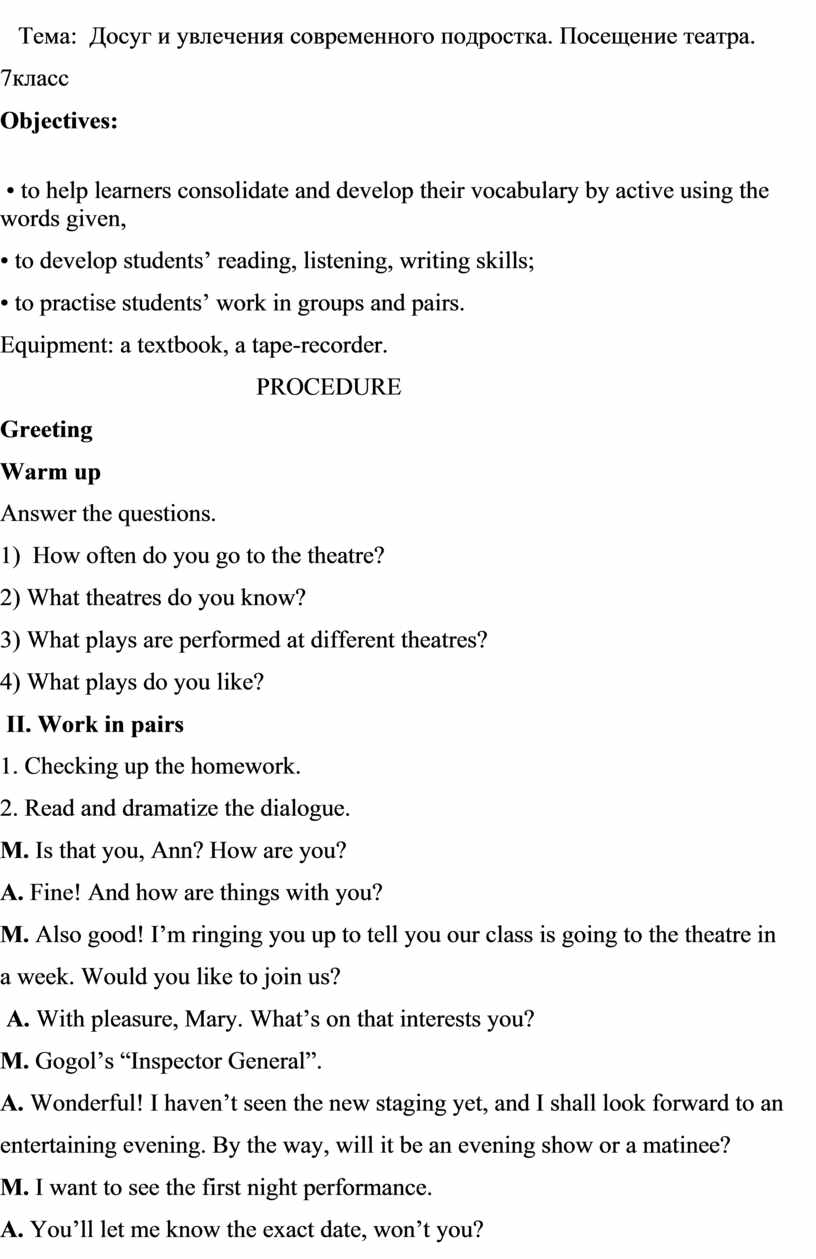 Тема: Досуг и увлечения современного подростка. Посещение театра. 7класс