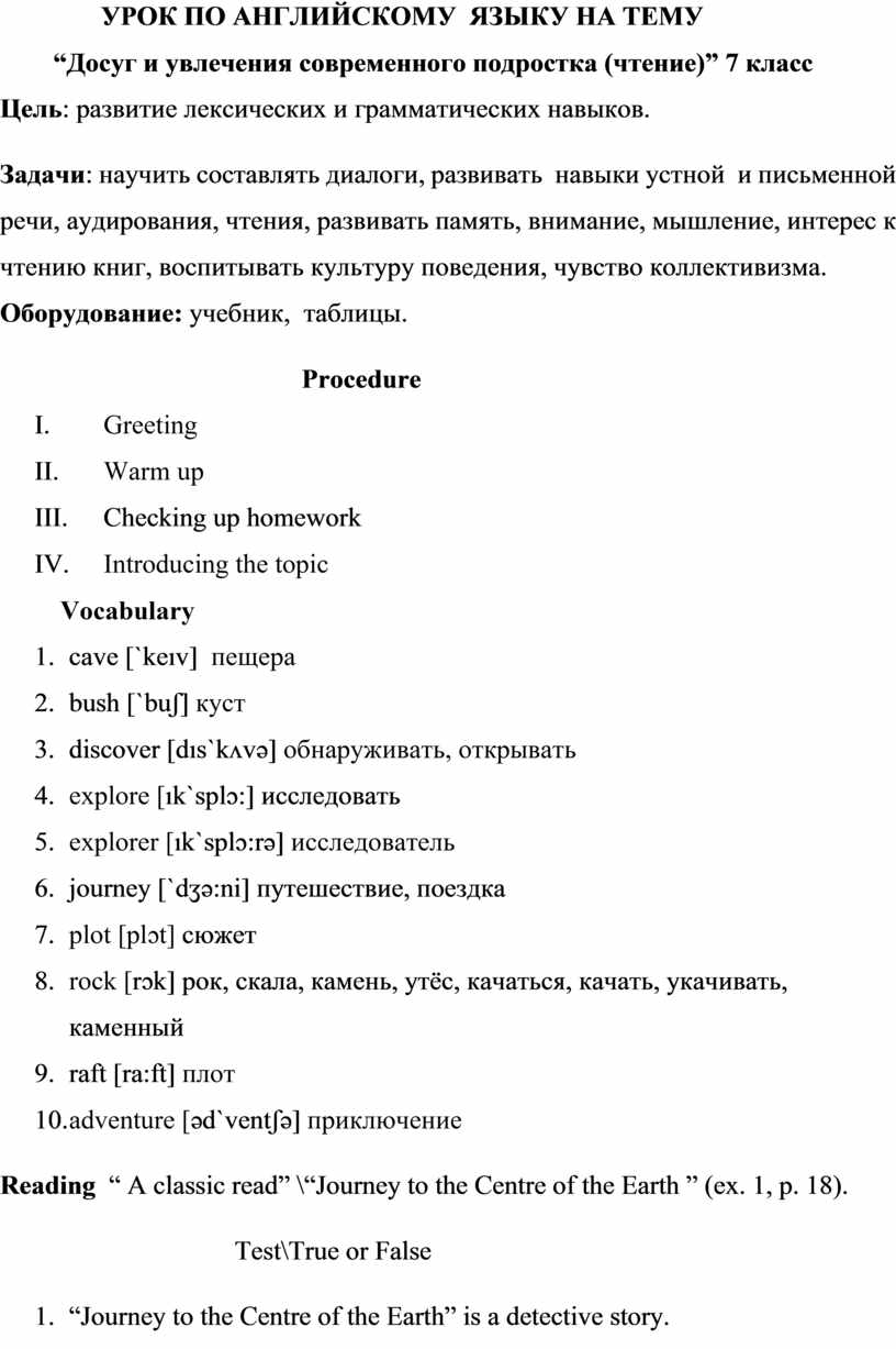 “Досуг и увлечения современного подростка (чтение)” 7 класс
