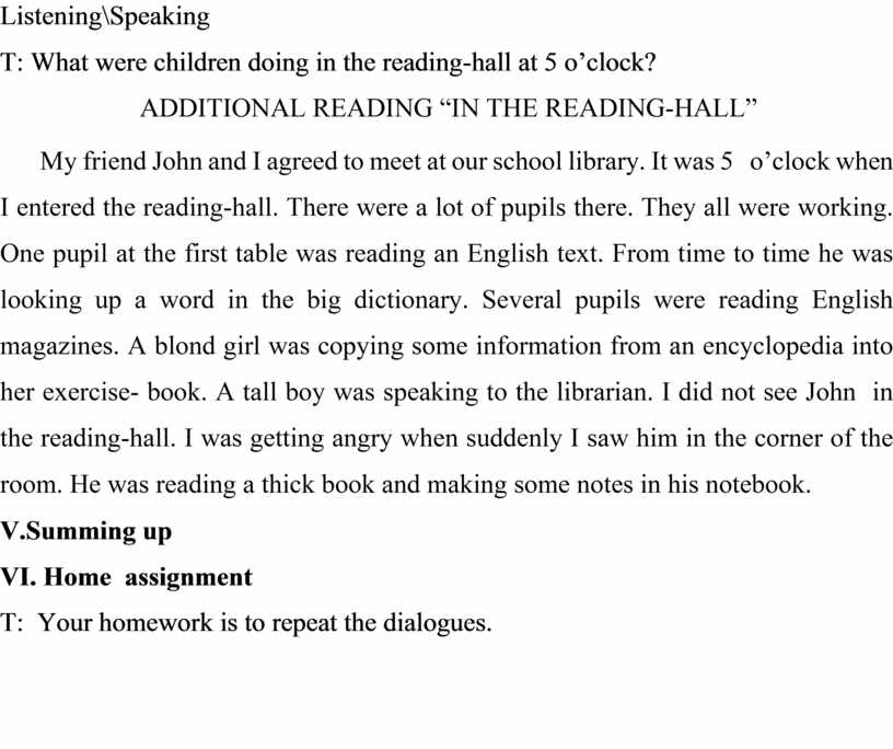 My friend John and I agreed to meet at our school library. It was 5 o’clock when I entered the reading-hall. There were a lot of pupils there. They all were working. One pupil at the first table was reading an English text. From time to time he was looking up a word in the big dictionary. Several pupils were reading English magazines. A blond girl was copying some information from an encyclopedia into her exercise- book. A tall boy was speaking to the librarian. I did not see John in the reading-hall. I was getting angry when suddenly I saw him in the corner of the room. He was reading a thick book and making some notes in his notebook.