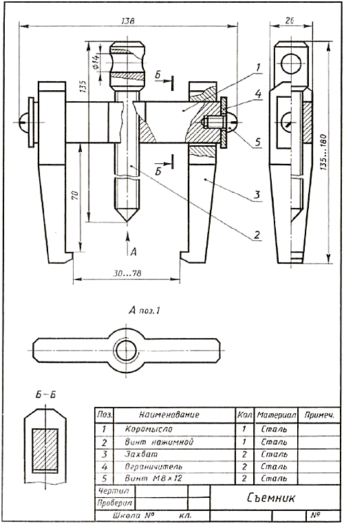 Основные детали съемника: коромысло (дет. 1), на которое надеты захваты (дет. 3) и нажимной винт (дет. 2). Предотвращает соскальзывание захвата с коромысла ограничитель (дет. 4), закрепленный винтами (дет. 5).