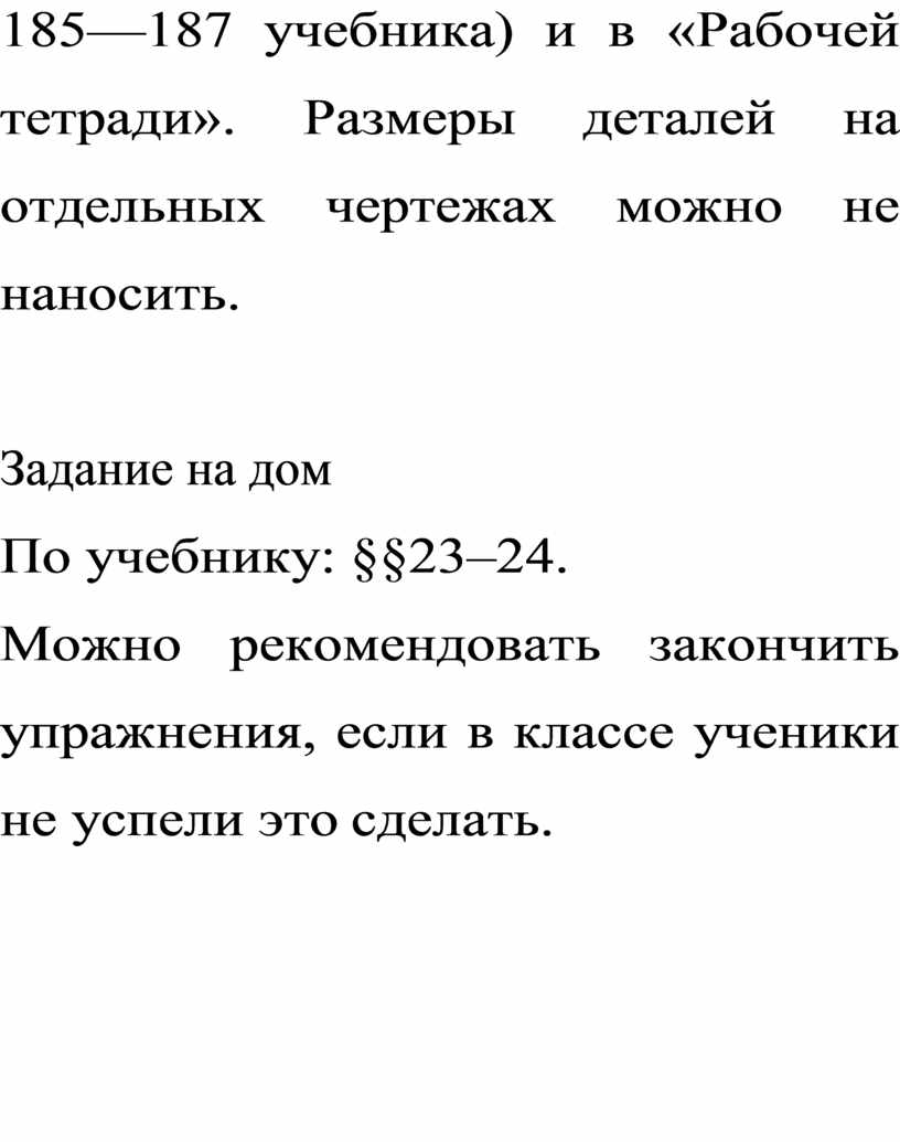 Выполнение упр. 51, 52, 53 (рис. 185—187 учебника) и в «Рабочей тетради». Размеры деталей на отдельных чертежах можно не наносить.
