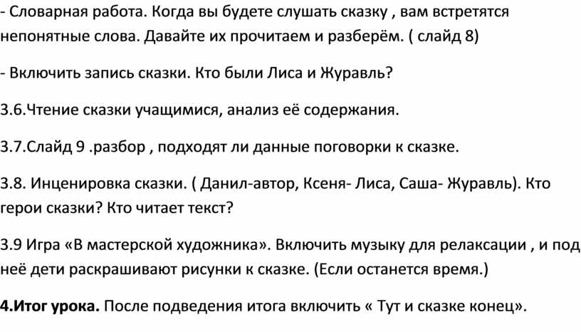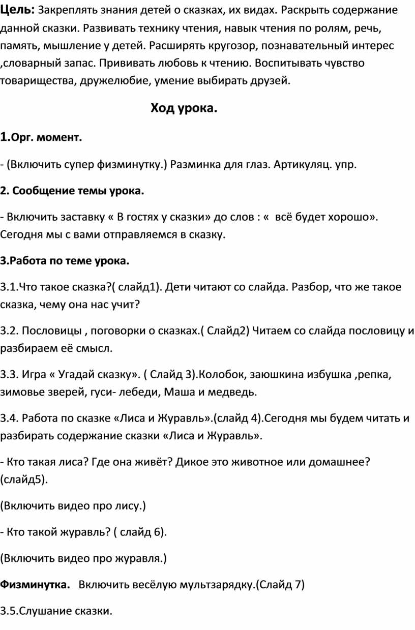 3.4. Работа по сказке «Лиса и Журавль».(слайд 4).Сегодня мы будем читать и разбирать содержание сказки «Лиса и Журавль».