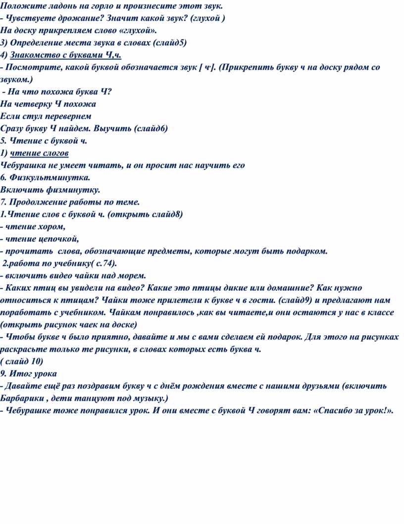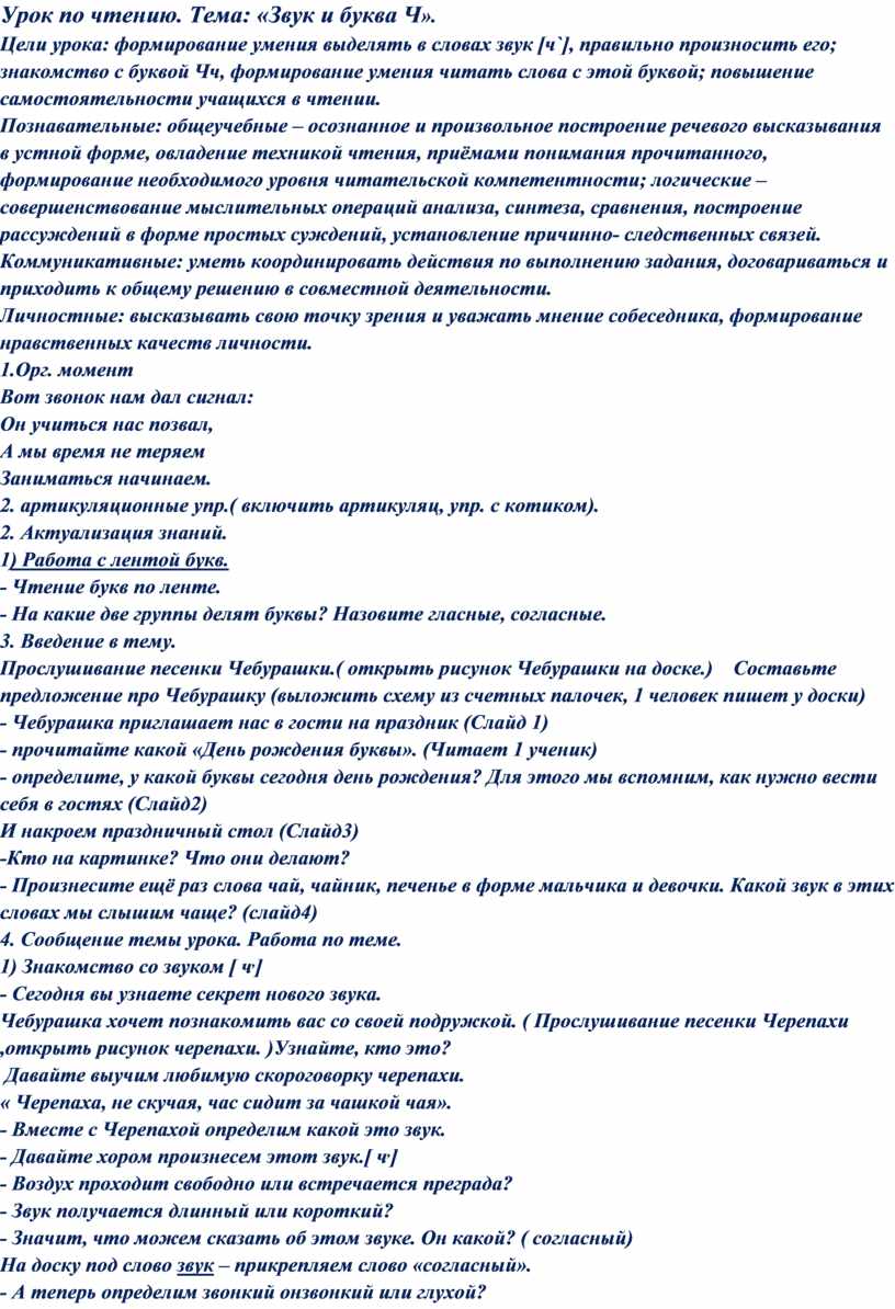 Урок по чтению. Тема: «Звук и буква Ч».
