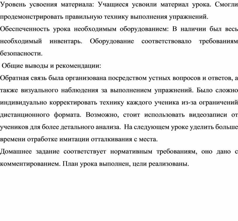 Обратная связь была организована посредством устных вопросов и ответов, а также визуального наблюдения за выполнением упражнений. Было сложно индивидуально корректировать технику каждого ученика из-за ограничений дистанционного формата. Возможно, стоит использовать видеозаписи от учеников для более детального анализа. На следующем уроке уделить больше времени отработке имитации отталкивания с места.
