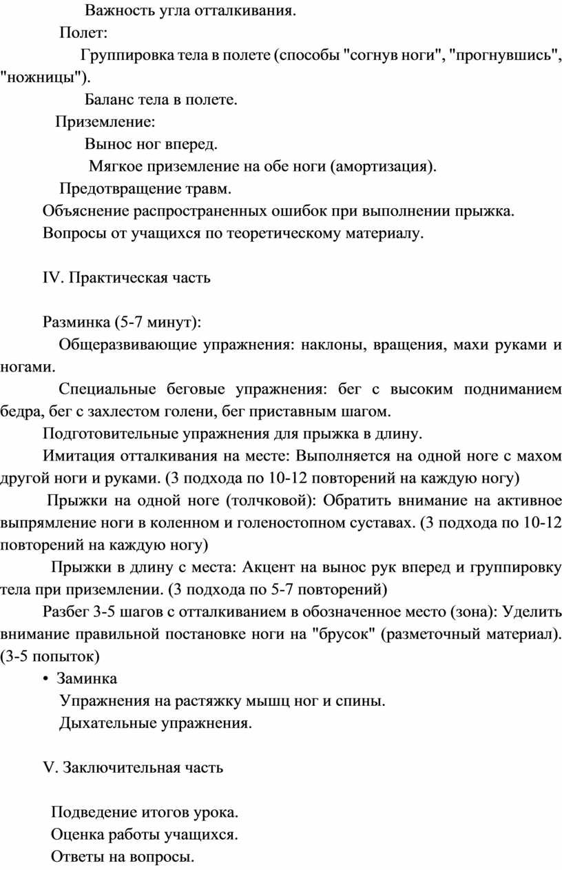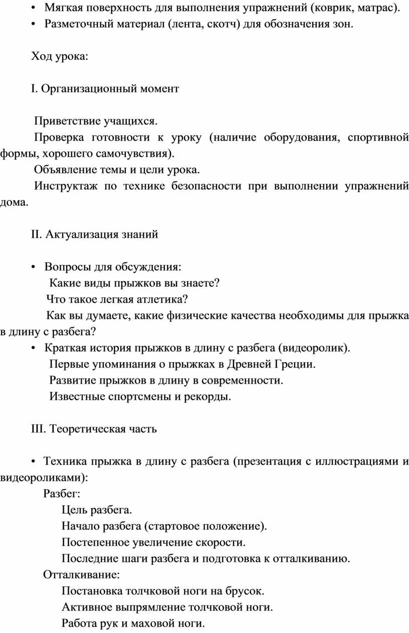 Цель: Формирование у обучающихся представления о технике прыжка в длину с разбега и первичное освоение подготовительных упражнений.