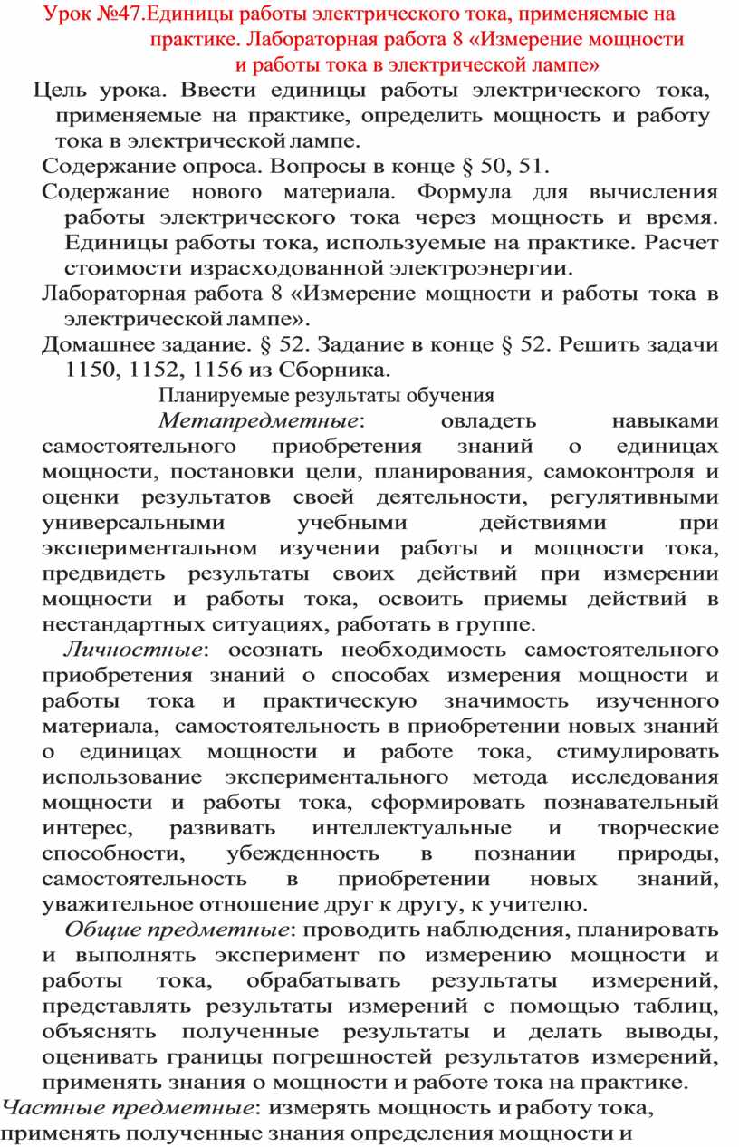 Метапредметные: овладеть навыками самостоятельного приобретения знаний о единицах мощности, постановки цели, планирования, самоконтроля и оценки результатов своей деятельности, регулятивными универсальными учебными действиями при экспериментальном изучении работы и мощности тока, предвидеть результаты своих действий при измерении мощности и работы тока, освоить приемы действий в нестандартных ситуациях, работать в группе.