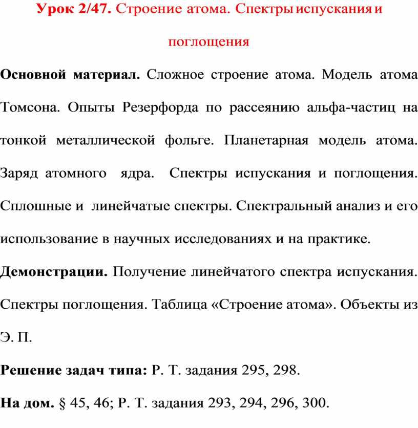 Основной материал. Сложное строение атома. Модель атома Томсона. Опыты Резерфорда по рассеянию альфа-частиц на тонкой металлической фольге. Планетарная модель атома. Заряд атомного ядра. Спектры испускания и поглощения. Сплошные и линейчатые спектры. Спектральный анализ и его использование в научных исследованиях и на практике.