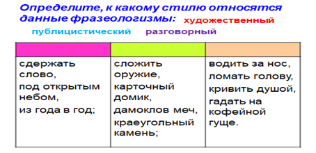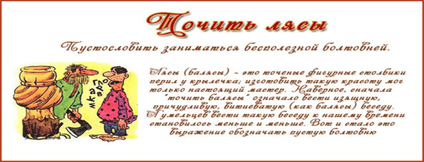 Учитель: Мы сейчас с Вами определили представленные средства выразительности: это эпитеты, сравнения, метафоры и среди них есть одно особое средство выразительности, которое образуется тоже на основе переносного значения слов, однако значение метафоры скрывается в переносном значении одного слова, которое возникает в сопоставлении со значением другого слова. Переносное значение фразеологизма уже устоявшееся, отшлифованное за длительное время существования этой языковой единицы и зачастую совершенно не вытекает из смысла слов, его составляющих. Отсюда и неделимость фразеологизма, его устойчивость. Кроме этого, фразеологизмы часто встречаются в разговорной речи, а метафора — это книжный приём, который создаёт автор и использует его часто только единожды.