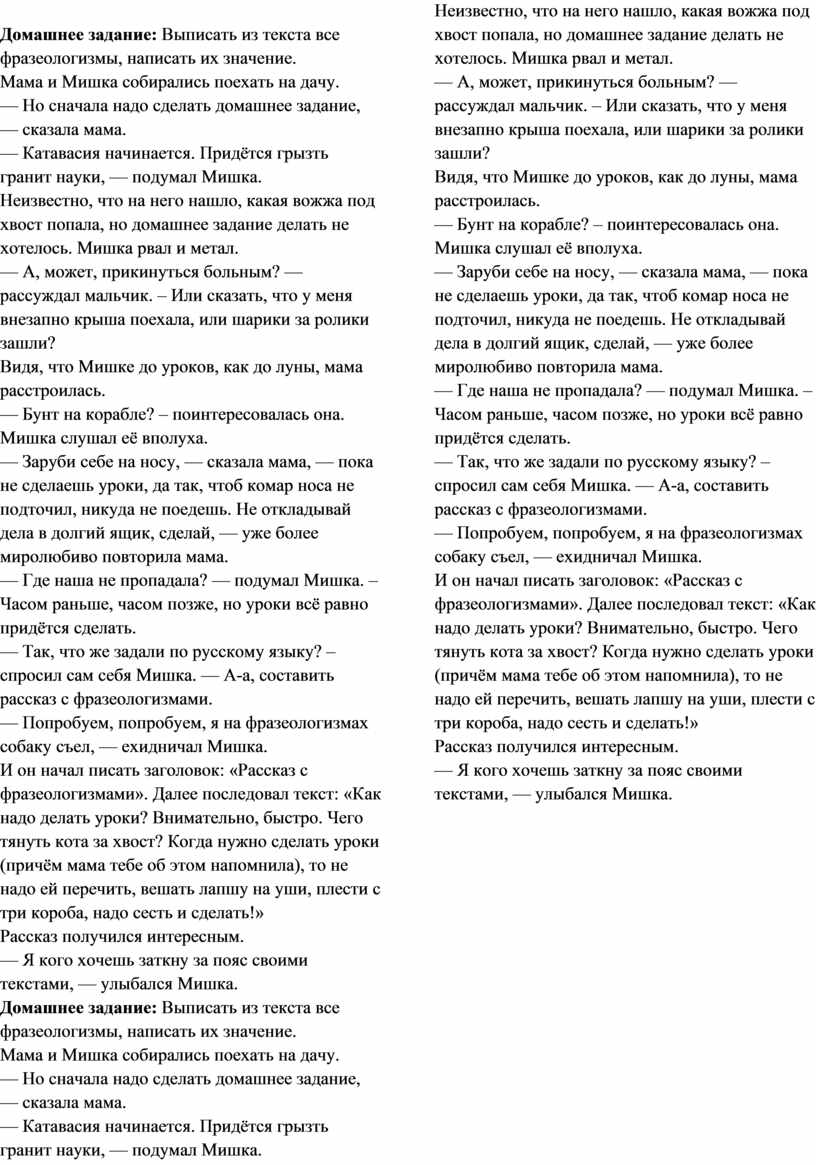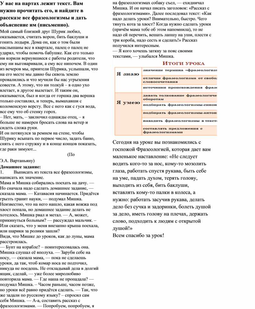 У вас на партах лежит текст. Вам нужно прочитать его, и найдите в рассказе все фразеологизмы и дать объяснение им (письменно в РТ).
