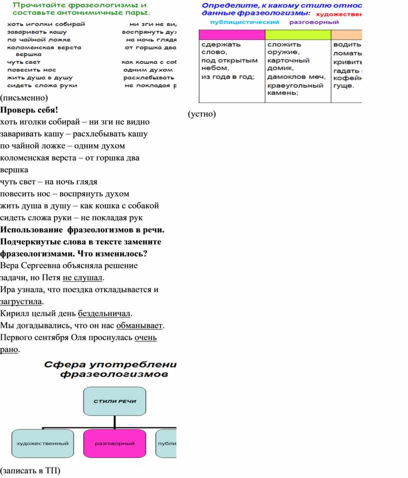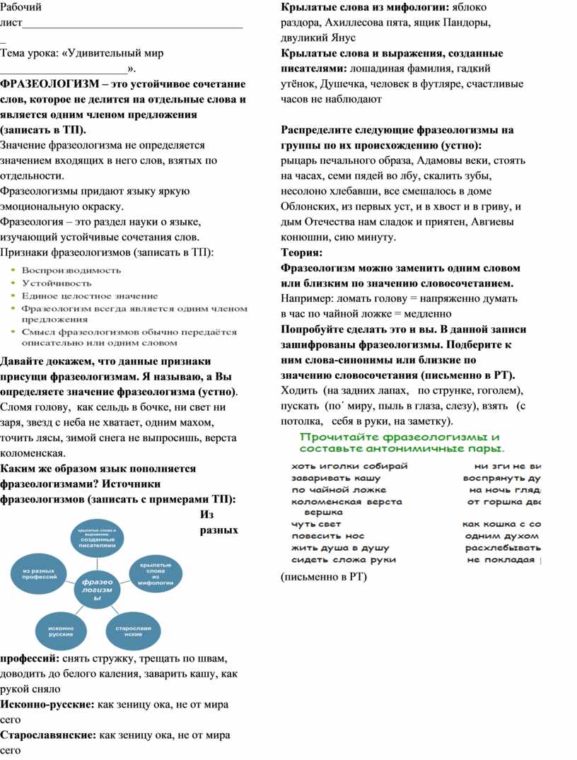 ФРАЗЕОЛОГИЗМ – это устойчивое сочетание слов, которое не делится на отдельные слова и является одним членом предложения (записать в ТП).
