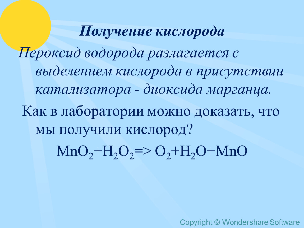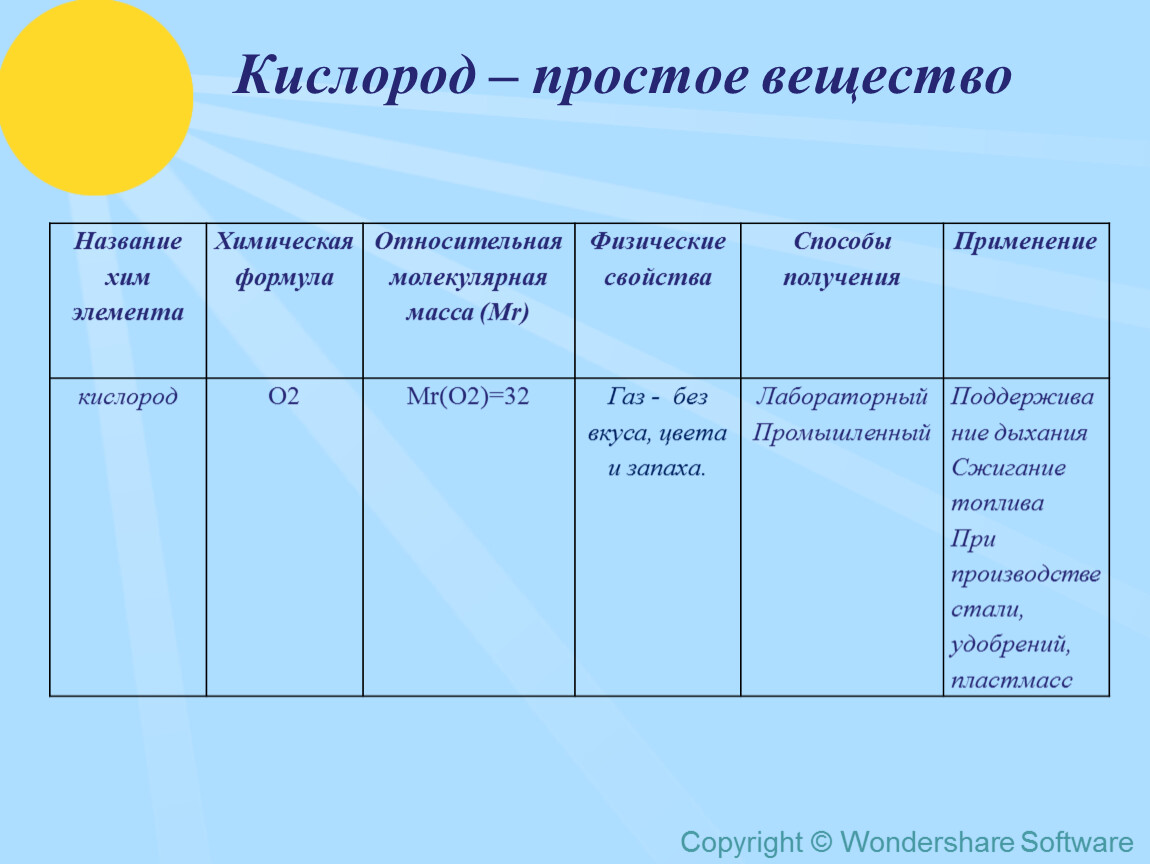 кислород | О2 | Мr(О2)=32 | Газ - без вкуса, цвета и запаха. | Лабораторный Промышленный | Поддерживание дыхания |