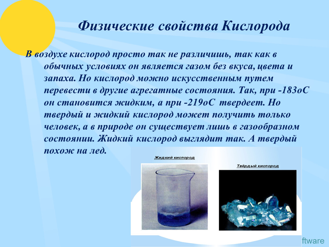 В воздухе кислород просто так не различишь, так как в обычных условиях он является газом без вкуса, цвета и запаха. Но кислород можно искусственным путем перевести в другие агрегатные состояния. Так, при -183оС он становится жидким, а при -219оС твердеет. Но твердый и жидкий кислород может получить только человек, а в природе он существует лишь в газообразном состоянии. Жидкий кислород выглядит так. А твердый похож на лед.