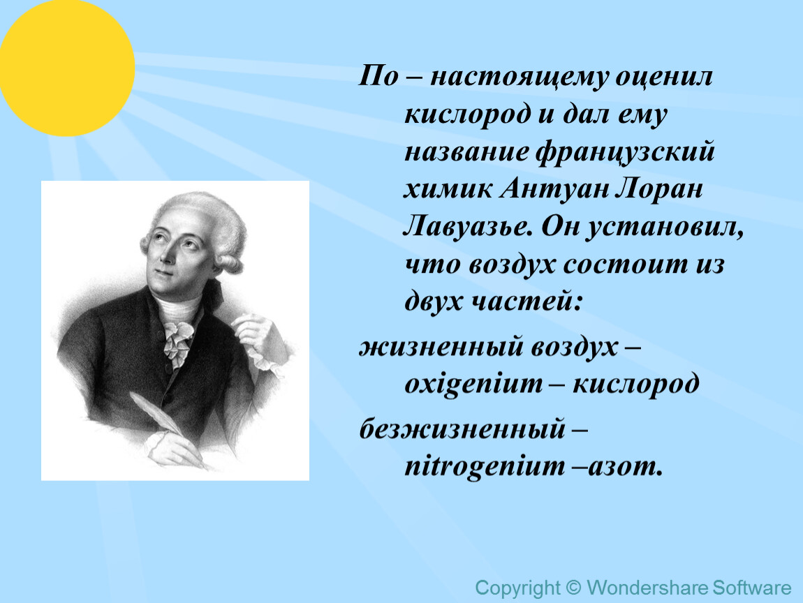 По – настоящему оценил кислород и дал ему название французский химик Антуан Лоран Лавуазье. Он установил, что воздух состоит из двух частей:
