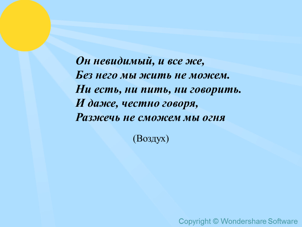 Он невидимый, и все же,Без него мы жить не можем.Ни есть, ни пить, ни говорить.И даже, честно говоря,Разжечь не сможем мы огня