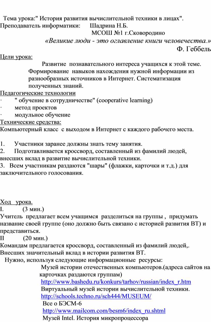 Музей истории отечественных компьютеров.(адреса сайтов на