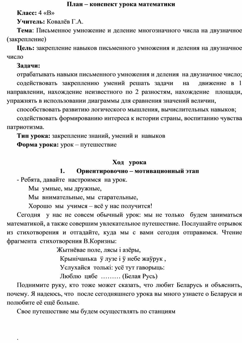 План – конспект урока математики