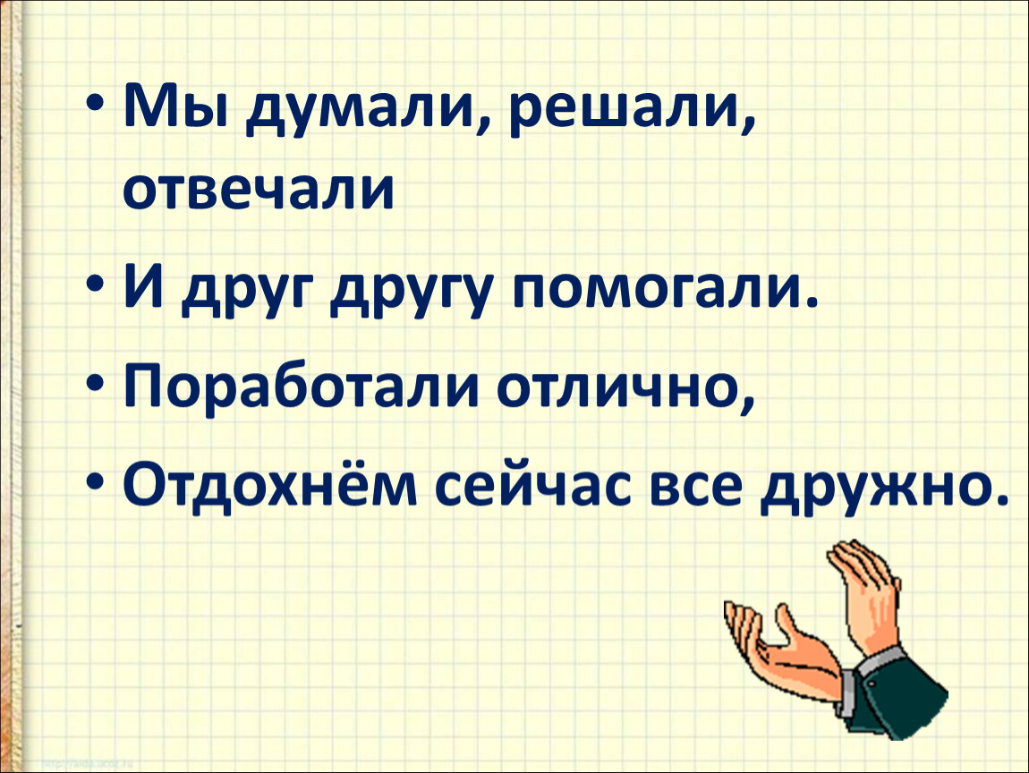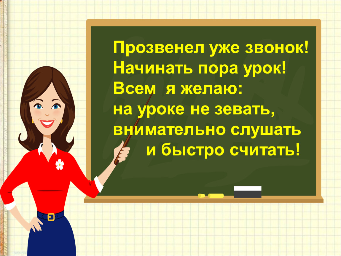 Прозвенел уже звонок! Начинать пора урок! Всем я желаю:на уроке не зевать,внимательно слушать и быстро считать!