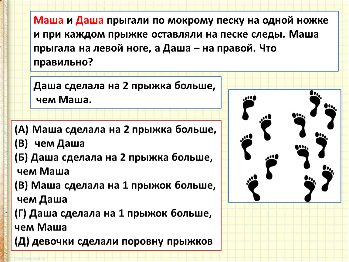Маша и Даша прыгали по мокрому песку на одной ножке и при каждом прыжке оставляли на песке следы. Маша прыгала на левой ноге, а Даша – на правой. Что правильно?