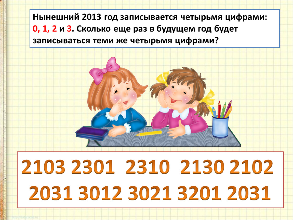 Нынешний 2013 год записывается четырьмя цифрами: 0, 1, 2 и 3. Сколько еще раз в будущем год будет записываться теми же четырьмя цифрами?