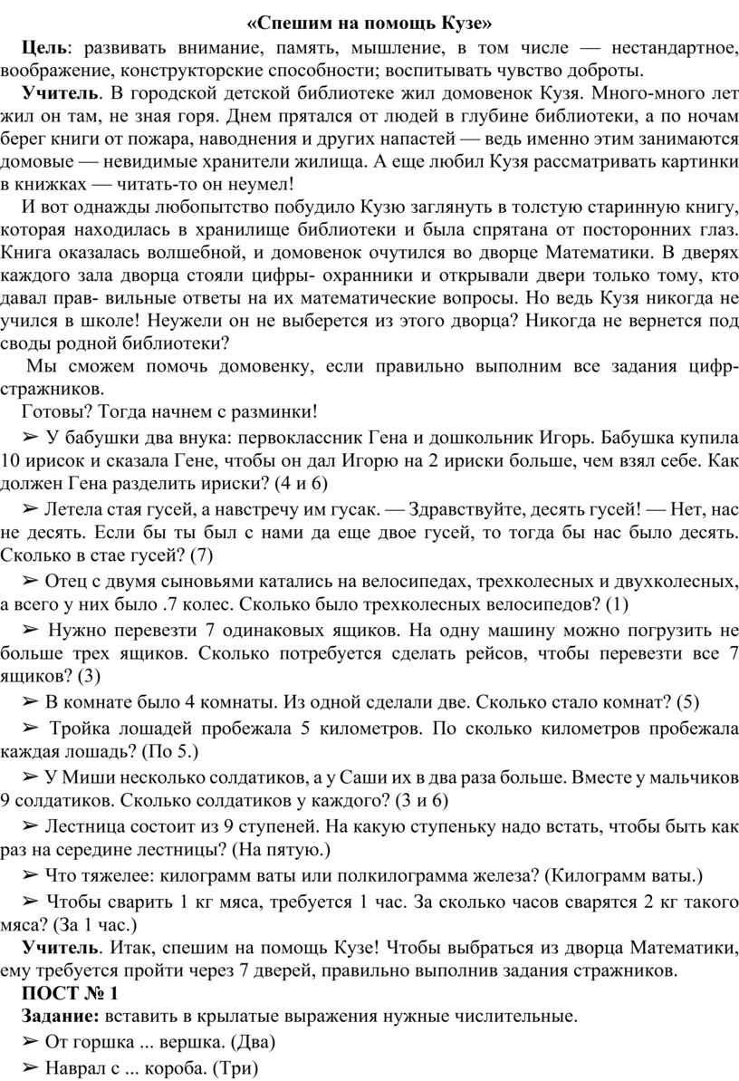 Учитель. Итак, спешим на помощь Кузе! Чтобы выбраться из дворца Математики, ему требуется пройти через 7 дверей, правильно выполнив задания стражников.
