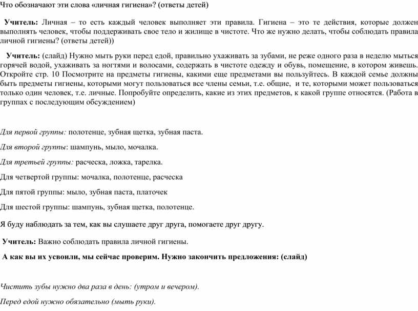 Станция «Чистота – залог здоровья». Учитель дает предметы и основание для классификации. Обучает приемам работы в группах. Помогает советом, как можно прийти к единому решению, поощряет сотрудничество. Учитель: Все жители Страны Здорового образа жизни соблюдают личную гигиену. Что обозначают эти слова «личная гигиена»? (ответы детей) Учитель: Личная – то есть каждый человек выполняет эти правила. Гигиена – это те действия, которые должен выполнять человек, чтобы поддерживать свое тело и жилище в чистоте. Что же нужно делать, чтобы соблюдать правила личной гигиены? (ответы детей)) Учитель: (слайд) Нужно мыть руки перед едой, правильно ухаживать за зубами, не реже одного раза в неделю мыться горячей водой, ухаживать за ногтями и волосами, содержать в чистоте одежду и обувь, помещение, в котором живешь. Откройте стр. 10 Посмотрите на предметы гигиены, какими еще предметами вы пользуйтесь. В каждой семье должны быть предметы гигиены, которыми могут пользоваться все члены семьи, т.е. общие, и те, которыми может пользоваться только один человек, т.е. личные. Попробуйте определить, какие из этих предметов, к какой группе относятся. (Работа в группах с последующим обсуждением)