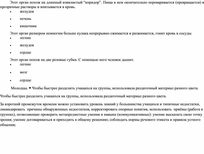 Учитель: У вас на партах лежат цветные карточки. Выберите себе одну карточку. Распределитесь в группы по цвету. С помощью какого органа дышит человек? · мозг; · легкие; · желудок. Что является главным отделением “внутренней кухни”? · легкие; · печень; · желудок. Какой орган управляет работой всего организма? · сердце; · мозг; · кишечник. Зачем нужно знать свой организм? · чтобы сохранять и укреплять здоровье; · чтобы человек мог мыслить, говорить, трудиться; · чтобы умело использовать свои возможности. Отметь галочкой то, что относится к внутреннему строению человека: голова, легкие, сердце, туловище, шея, мозг, печень, живот. В какой строчке указаны слова, описывающие здорового человека? · сутулый, крепкий, неуклюжий, высокий; · горбатый, бледный, хилый, низкий; · стройный, сильный, ловкий, статный.