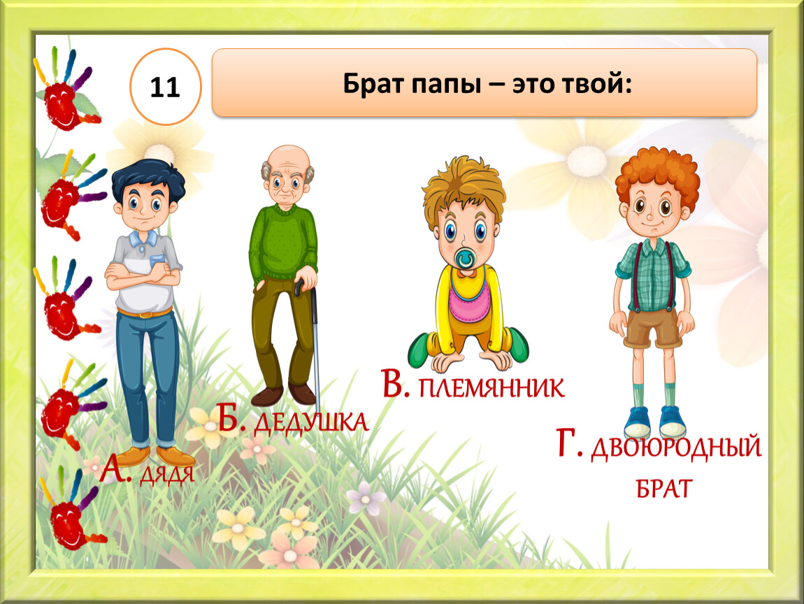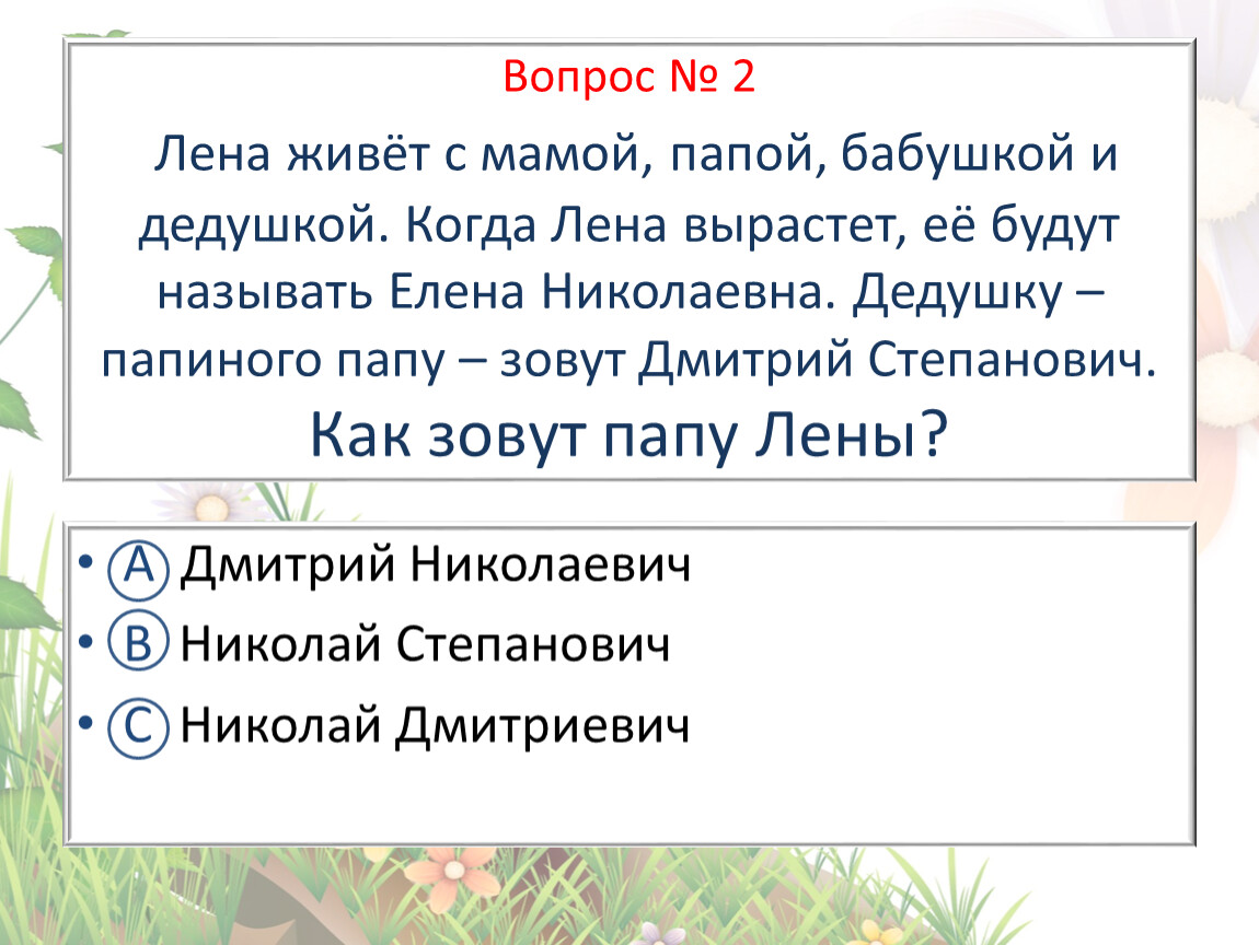 Вопрос № 2 Лена живёт с мамой, папой, бабушкой и дедушкой. Когда Лена вырастет, её будут называть Елена Николаевна. Дедушку – папиного папу – зовут Дмитрий Степанович. Как зовут папу Лены?