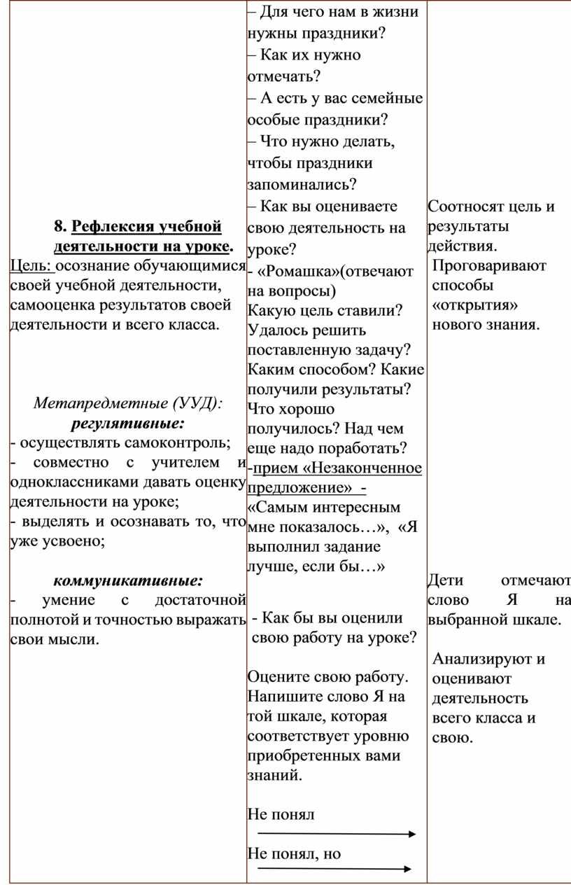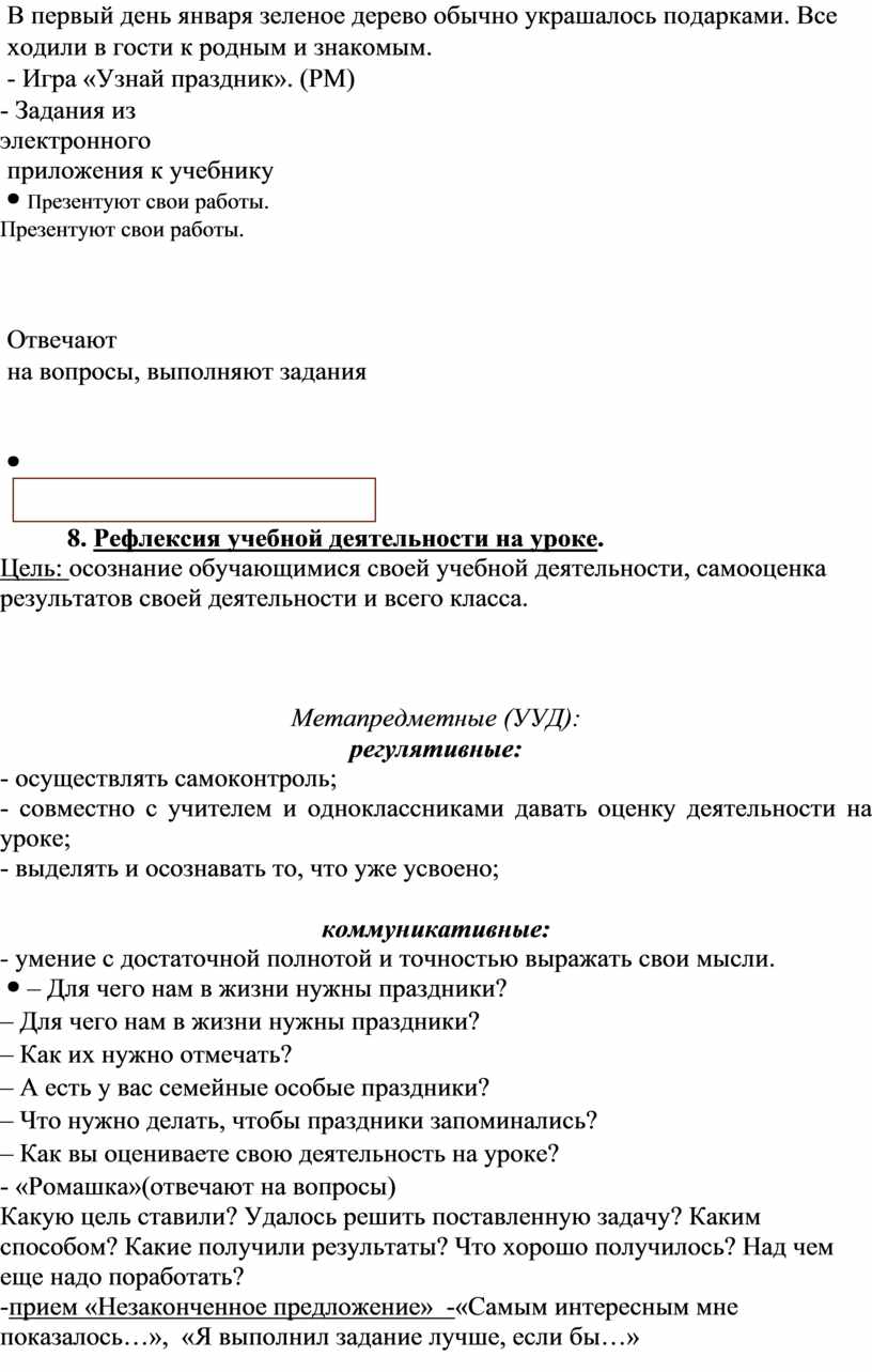 – Для чего нам в жизни нужны праздники? – Как их нужно отмечать? – А есть у вас семейные особые праздники? – Что нужно делать, чтобы праздники запоминались? – Как вы оцениваете свою деятельность на уроке? - «Ромашка»(отвечают на вопросы) Какую цель ставили? Удалось решить поставленную задачу? Каким способом? Какие получили результаты? Что хорошо получилось? Над чем еще надо поработать? -прием «Незаконченное предложение» -«Самым интересным мне показалось…», «Я выполнил задание лучше, если бы…»