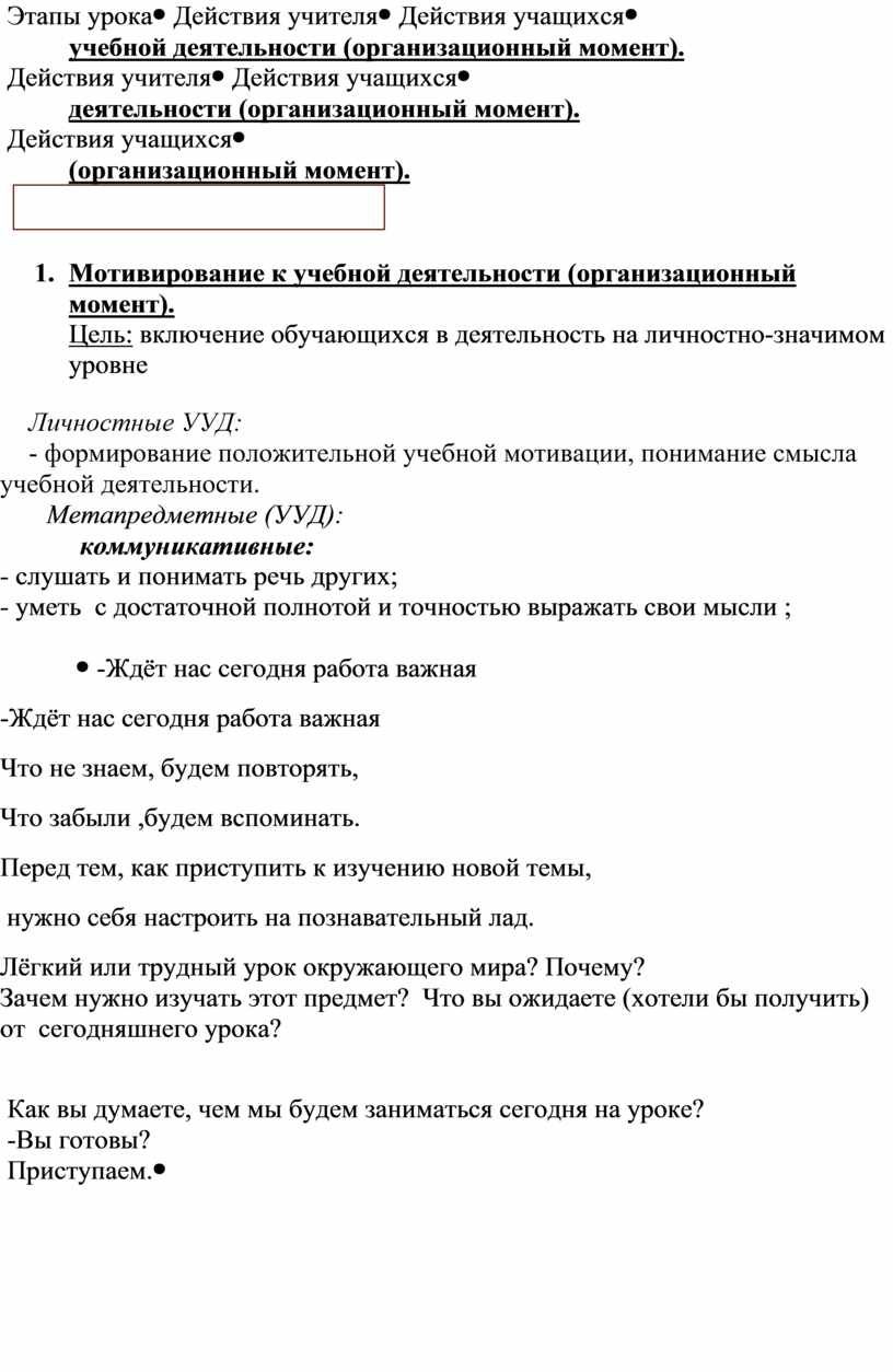 1. Мотивирование к учебной деятельности (организационный момент). Цель: включение обучающихся в деятельность на личностно-значимом уровне Личностные УУД: - формирование положительной учебной мотивации, понимание смысла учебной деятельности. Метапредметные (УУД): коммуникативные: - слушать и понимать речь других; - уметь с достаточной полнотой и точностью выражать свои мысли ;