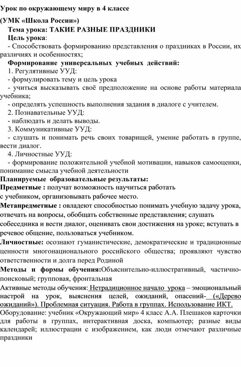 Оборудование: учебник «Окружающий мир» 4 класс А.А. Плешаков карточки для работы в группах, интерактивная доска, компьютер; разные виды календарей; иллюстрации с изображением, как люди отмечают различные праздники