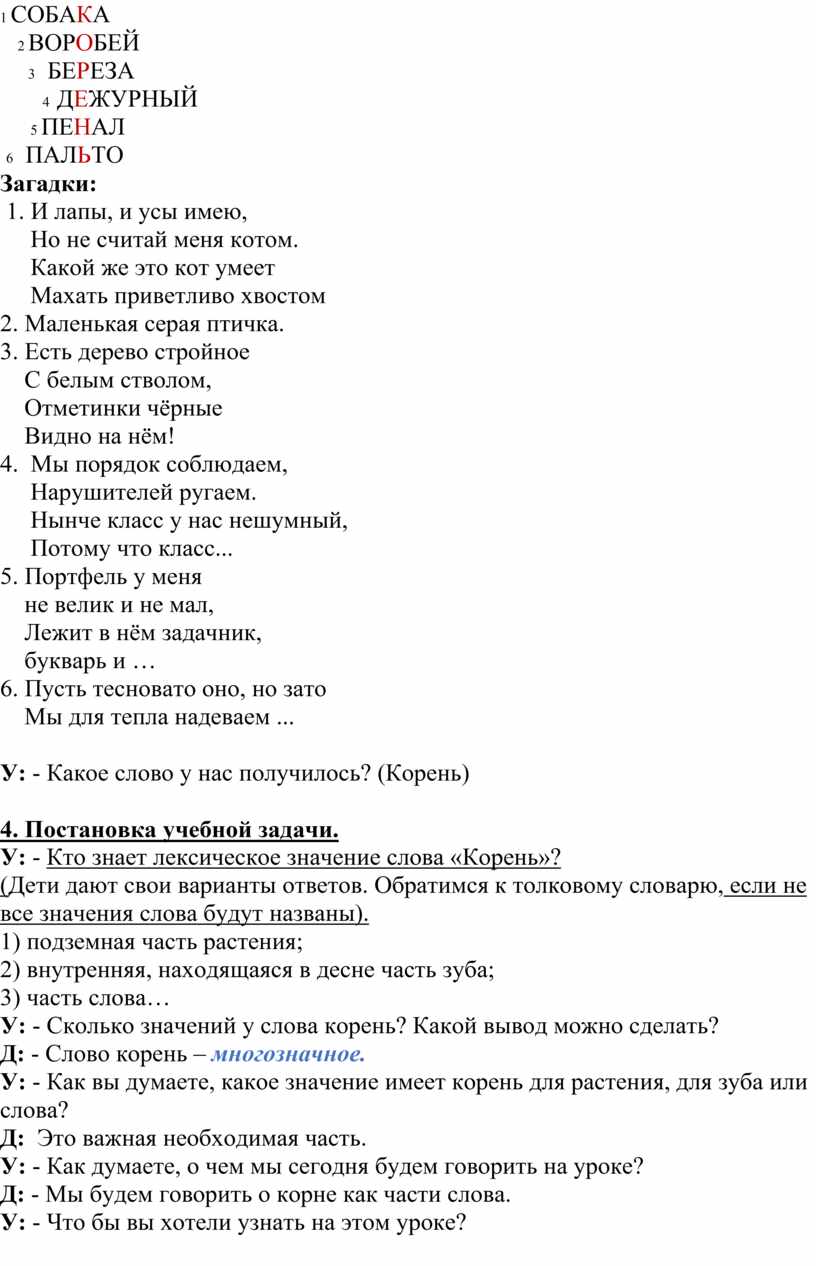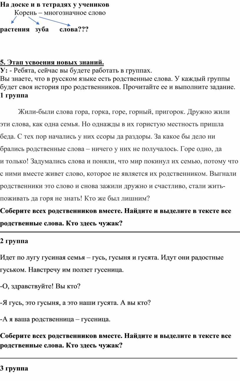 3) Научить: выделять корень в родственных словах с опорой на смысловую связь однокоренных слов и общность написания корней; определять группу родственных слов и обосновывать своё мнение.