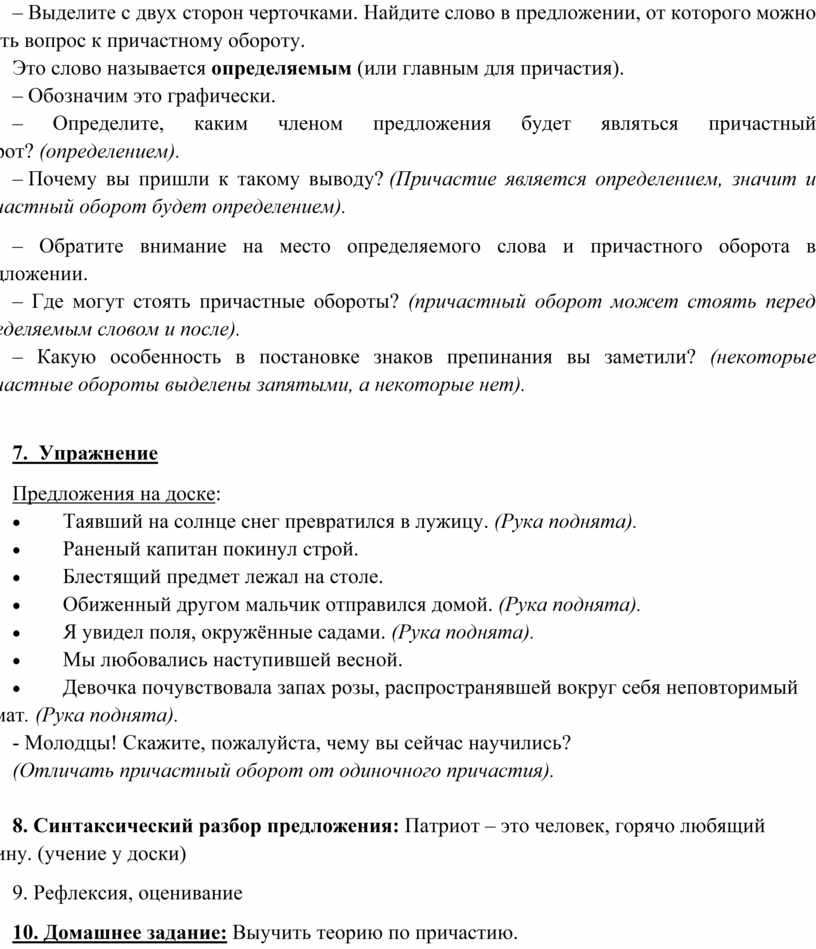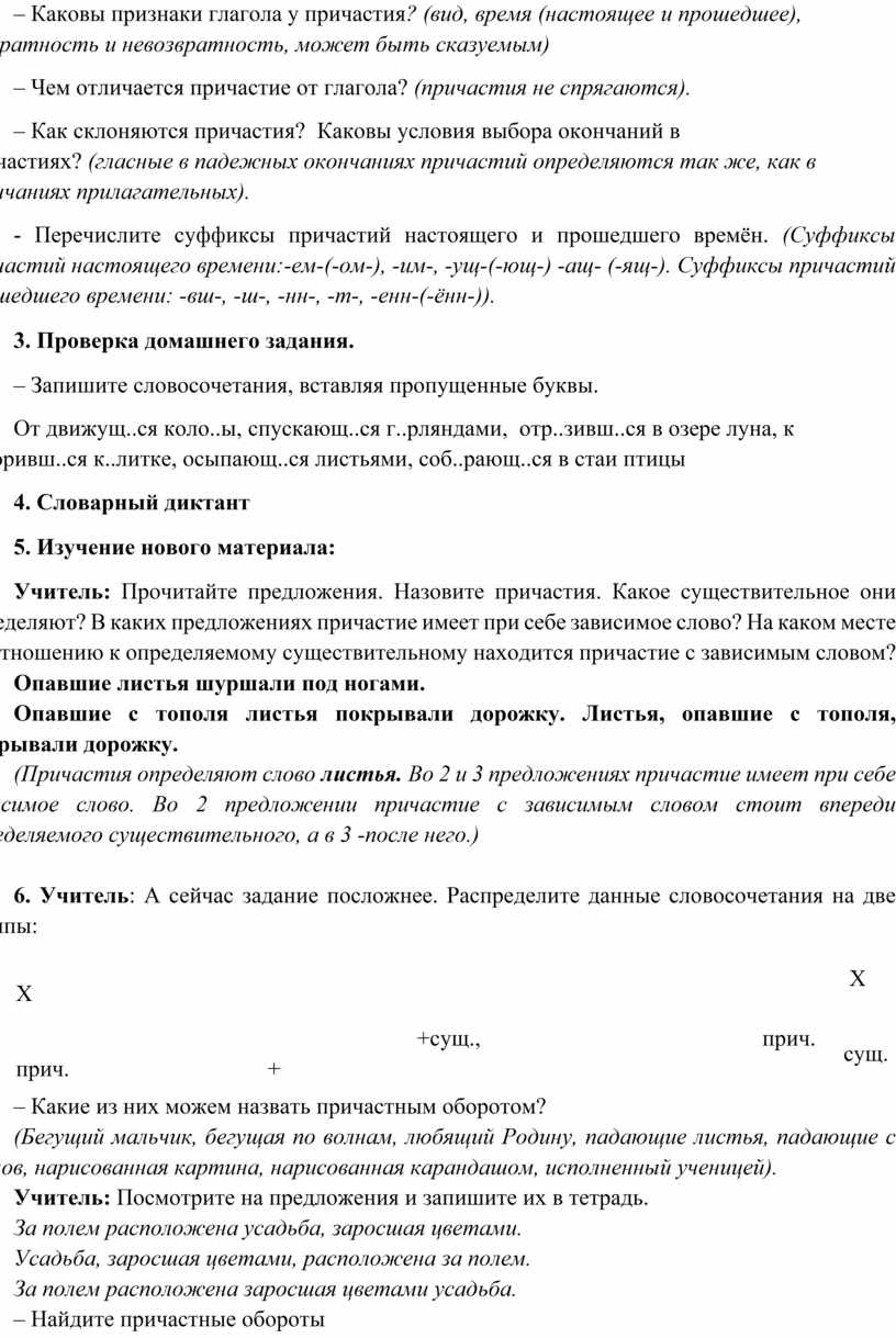 – Как склоняются причастия? Каковы условия выбора окончаний в причастиях? (гласные в падежных окончаниях причастий определяются так же, как в окончаниях прилагательных).