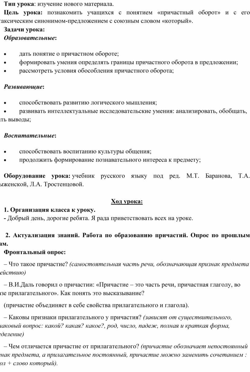Цель урока: познакомить учащихся с понятием «причастный оборот» и с его синтаксическим синонимом-предложением с союзным словом «который».