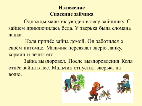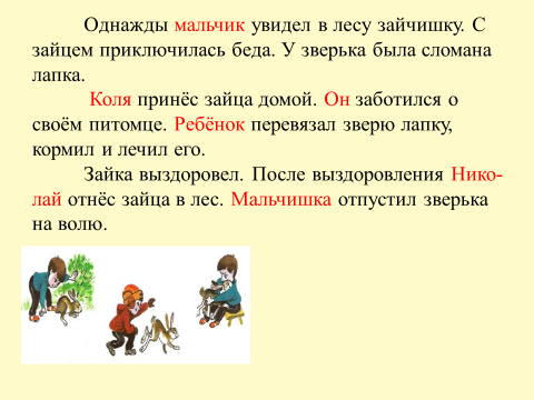 Однажды мальчик увидел в лесу зайчишку. С зайцем приключилась беда. У зверька была сломана лапка. Коля принёс зайца домой. Он заботился о своём питомце. Ребёнок перевязал зверю лапку, кормил и лечил его. Зайка выздоровел. После выздоровления Нико- лай отнёс зайца в лес. Мальчишка отпустил зверька на волю.