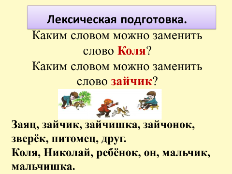 Лексическая подготовка.Каким словом можно заменить слово Коля?Каким словом можно заменить слово зайчик?