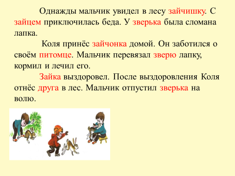 Однажды мальчик увидел в лесу зайчишку. С зайцем приключилась беда. У зверька была сломана лапка. Коля принёс зайца домой. Он заботился о своём питомце. Мальчик перевязал зверю лапку, кормил и лечил его. Зайка выздоровел. После выздоровления Коля отнёс зайца в лес. Мальчик отпустил зверька на волю.