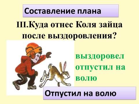 III.Куда отнес Коля зайца после выздоровления?