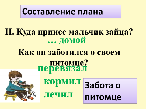 II. Куда принес мальчик зайца?Как он заботился о своем питомце?