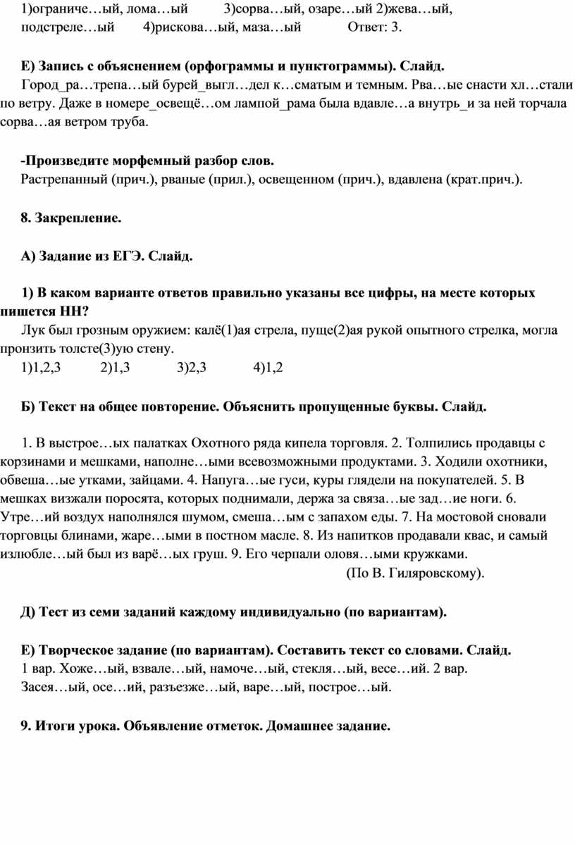 1. В выстрое…ых палатках Охотного ряда кипела торговля. 2. Толпились продавцы с корзинами и мешками, наполне…ыми всевозможными продуктами. 3. Ходили охотники, обвеша…ые утками, зайцами. 4. Напуга…ые гуси, куры глядели на покупателей. 5. В мешках визжали поросята, которых поднимали, держа за связа…ые зад…ие ноги. 6. Утре…ий воздух наполнялся шумом, смеша…ым с запахом еды. 7. На мостовой сновали торговцы блинами, жаре…ыми в постном масле. 8. Из напитков продавали квас, и самый излюбле…ый был из варё…ых груш. 9. Его черпали оловя…ыми кружками.