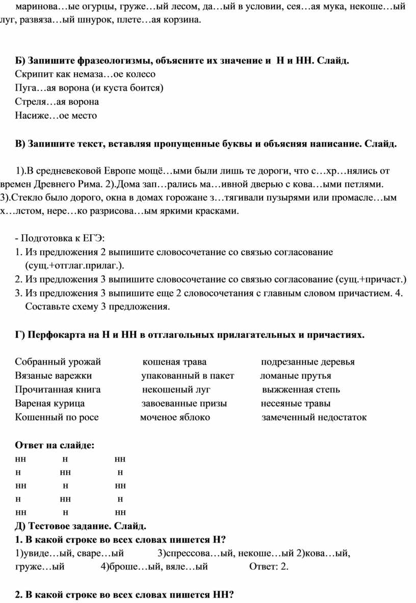 Г) Перфокарта на Н и НН в отглагольных прилагательных и причастиях.