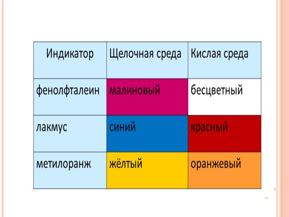 Название | Фенолфталеин | Метиловый оранжевый | Лакмус | Универсальный бум. индикатор |
