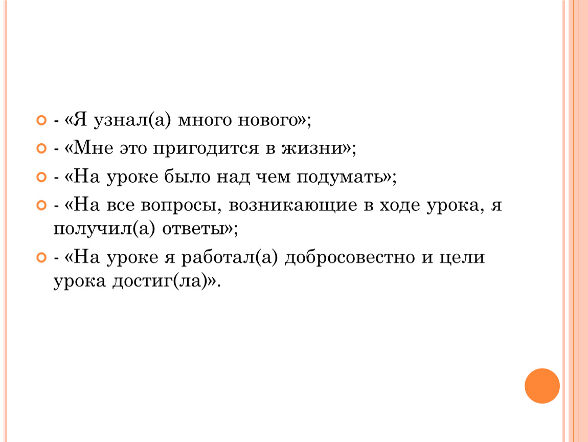 - «На уроке я работал(а) добросовестно и цели урока достиг(ла)».
